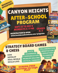 Come explore the world of strategy board games (including Chess). This SCREEN-FREE after-school program focuses LEARNING THROUGH PLAY, where kids develop skills such as problem-solving, critical thinking, math, logic, planning, communication and negotiation.